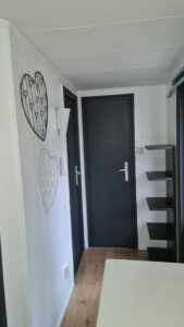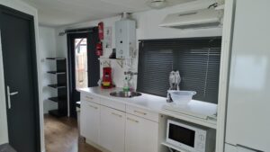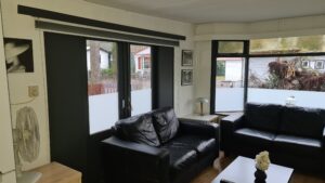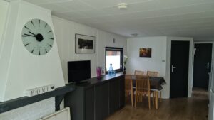 Binnen staat een fijne, grote bank, salontafel, tv. Het geheel wordt verwarmd met een warmtepomp.