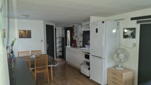 Volledig ingerichte keuken met alle toebehoren, koelkast, Senseo apparaat, combi magnetron etc. (wasmachine aanwezig)