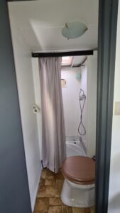 Badkamer met douche, wastafel en toilet.